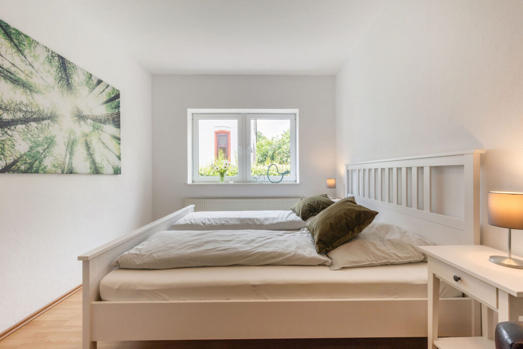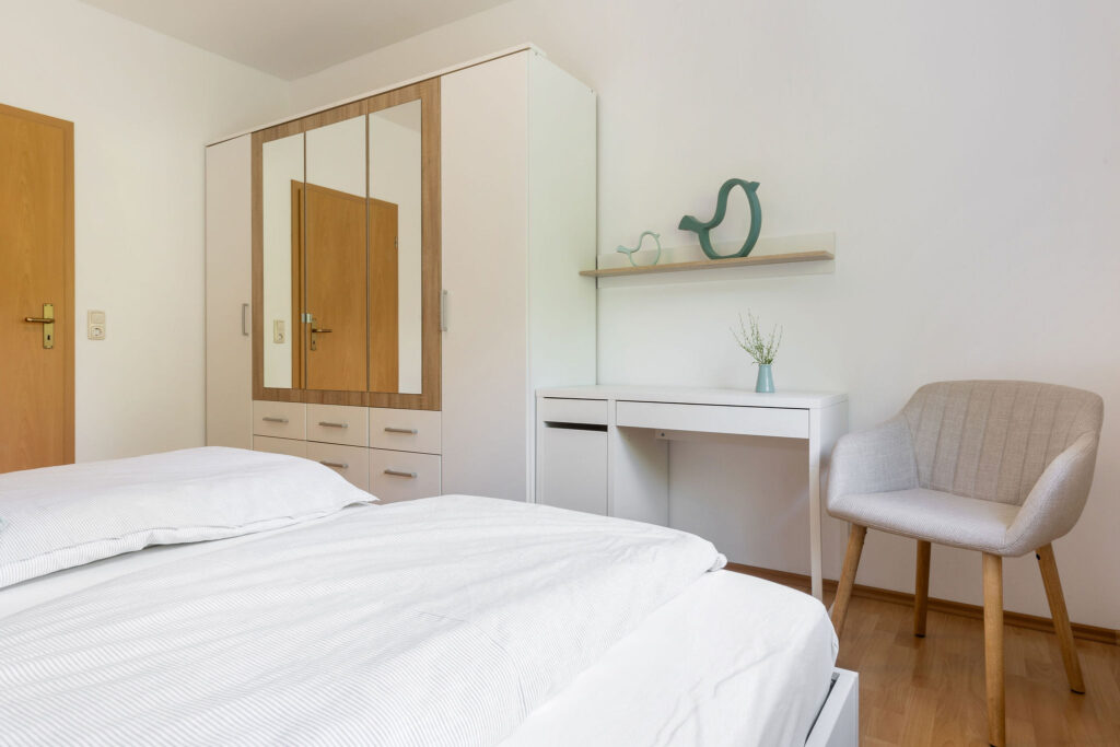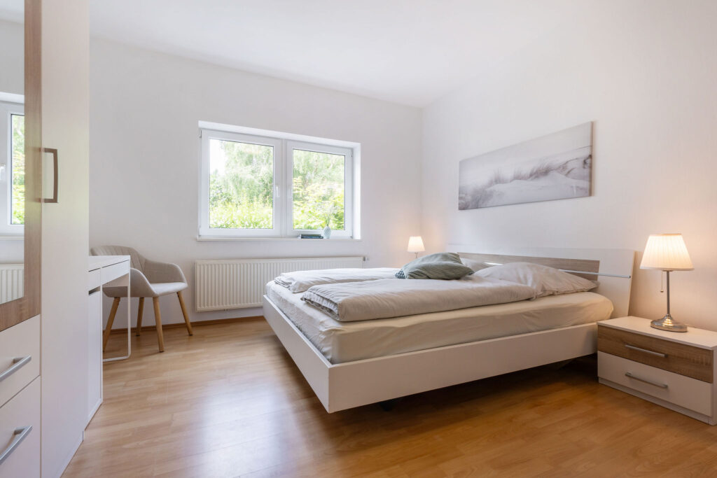 - Erstes Schlafzimmer mit großem Doppelbett, Schrank und Schreibtisch