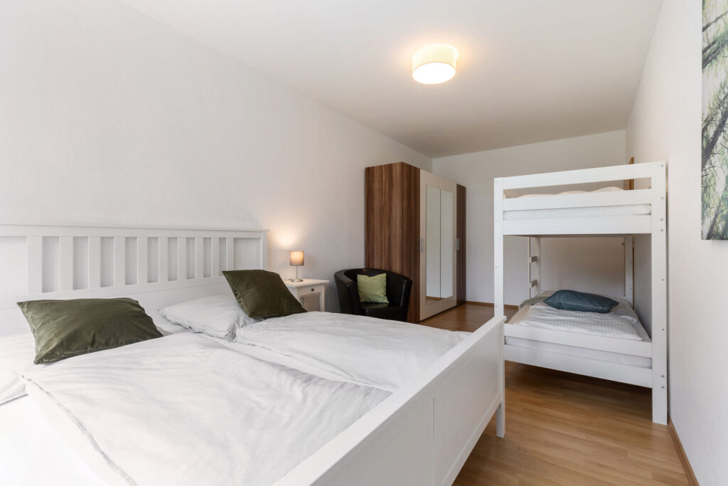 - Schlafzimmer mit großem Doppelbett, Etagenbett und Schrank